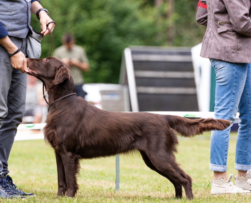 Die 11 Monate alte Flathündin zeigt während der ganzen Sichtung ihre ausgerpägten jagdlichen Anlagen.